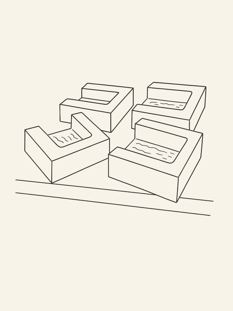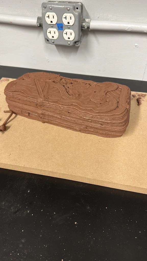Initial test prints for the mudbrick failed due to issues with the machinery and mix. We decided to pivot to molded bricks for the exhibition. Four mold pieces were printed (two top, two bottom) based on our mudbrick dimensions. Using the same clay mixtures with some added water, we began testing mold-based fabrication.
