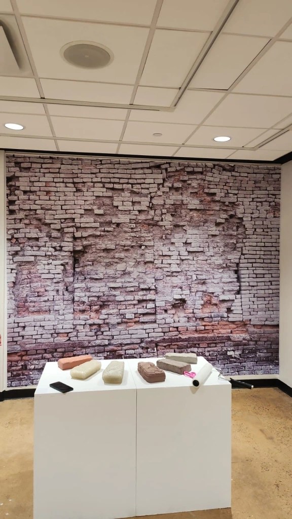 Top row: 3D printing in process and making mudbrick mixtures Bottom row: Greg Sheward (Left); Mudbrick study display at ‘Visualizing Care’ exhibition (Right)